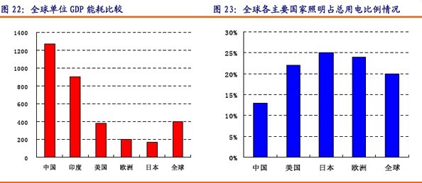 中國政府也已經(jīng)開始實(shí)現(xiàn)照明節(jié)能計(jì)劃,目標(biāo)是到2010年每年降低能耗10%。在目前的照明用電占整個(gè)用電的比例中,可以看出中國照明用電比例低于全球主要經(jīng)濟(jì)發(fā)達(dá)國家,也低于全球的平均水平,說明工業(yè)用電比例較高,從而使得單位GDP所消耗的能源明顯高于全球平均水平。