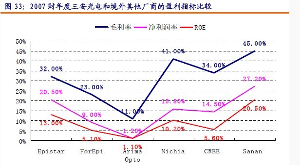 從盈利指標(biāo)來看,2007年度三安光電的銷售毛利率達(dá)到45%,凈利潤率達(dá)到27.2%,REO為20.50%,遠(yuǎn)高于其他國際大廠的盈利指標(biāo)。其中可能的原因分析來看,國內(nèi)MOCVD設(shè)備折舊年限、國內(nèi)制造費(fèi)用先對較低、臺灣廠商進(jìn)入2008年實(shí)行股權(quán)、股票、分紅等激勵(lì)措施的原因造成國內(nèi)上游LED廠商的盈利能力平均高于國外廠商。