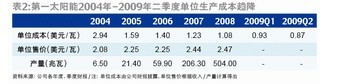 第一太陽能持續(xù)不衰的競爭力主要來自不斷降低單位制造成本的能力。財(cái)務(wù)數(shù)據(jù)顯示,第一太陽能的單位制造成本已經(jīng)從2004年的2.94美元/瓦壓縮至2008年的1.08美元/瓦。而在光伏產(chǎn)業(yè)掉頭向下的2008年四季度,第一太陽能的平均生產(chǎn)成本降到了每瓦0.98美元,是全球首家生產(chǎn)成本低于每瓦1美元的太陽能廠商。2009年其生產(chǎn)成本進(jìn)一步降低,一季度和二季度分別為0.93美元/瓦和0.87美元/瓦(表2)。第一太陽能的總裁公開表示,預(yù)計(jì)2014年其薄膜電池的生產(chǎn)成本可望降至0.52-0.63美元/瓦,且光電轉(zhuǎn)換效率由目前的10.9%提升至12.5%。