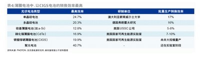 從成本來看,中投證券認(rèn)為,盡管晶體硅價(jià)格暴跌,CIGS仍具成本優(yōu)勢(shì)。首先,由于CIGS電池尚未達(dá)到量產(chǎn),通過成本細(xì)拆,參照工藝類似的第一太陽能的成本構(gòu)成(主要是設(shè)備折舊、玻璃、材料和人工等四項(xiàng)),在規(guī)?;?yīng)下,CIGS薄膜電池的成本約為1.07美元/瓦,已遠(yuǎn)低于目前的晶體硅電池成本。其次,CIGS電池采用相對(duì)廉價(jià)的玻璃為襯底,這樣所需的稀有元素耗損量大為減少;另外,CIGS電池的弱光效應(yīng)較好,對(duì)光照的要求降低,運(yùn)行時(shí)間遠(yuǎn)高于晶體硅電池。