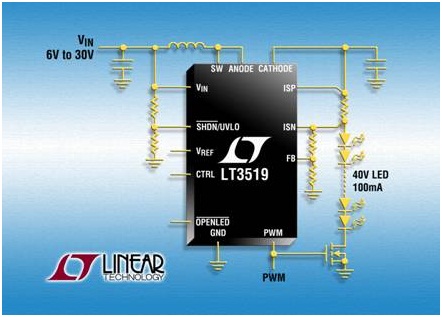 LT3519 在 LED 的高端檢測輸出電流,從而可實(shí)現(xiàn)降壓、降壓-升壓或升壓型配置。結(jié)合傳統(tǒng)電壓反饋和獨(dú)特的浮動(dòng)電流檢測反饋,這些轉(zhuǎn)換器可以作為恒定電壓或恒定電流源工作,從而提供最大的設(shè)計(jì)靈活性。其它特點(diǎn)包括:開路 LED 保護(hù)、軟啟動(dòng)和熱保護(hù)。