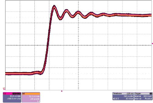 由于邊沿的頻率成分超過5 GHz的內(nèi)奎斯特速率,力科和泰克示波器在SinX內(nèi)插中展現(xiàn)出預(yù)計的劣化。