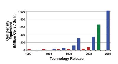 圖2顯示了Fairchild公司≤30V的N溝道MOSFET單元密度的進(jìn)步。每個(gè)條形都表示新的工藝進(jìn)步??梢钥吹剑谧罱氖曛?,單元密度從3200萬(wàn)單元/平方英寸增加到現(xiàn)在的10億單元/平方英寸。