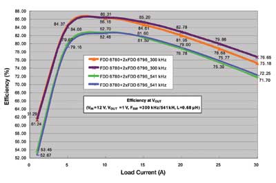 注意上面的兩條曲線,在滿(mǎn)載(30A)時(shí),可以看到最新的器件的效率有1.5%的改進(jìn)。同樣還是這兩條曲線,在負(fù)荷較?。?5A)時(shí),可以實(shí)現(xiàn)0.69%的改善。如果對(duì)整個(gè)負(fù)荷范圍積分,那么與今天常見(jiàn)的方案相比,使用最新的MOSFET器件時(shí)平均功率損耗可以降低8%~10%。即使在較高的開(kāi)關(guān)頻率541kHz處,可以看到在負(fù)荷小時(shí)系統(tǒng)級(jí)效率仍然高于80%,而在滿(mǎn)載時(shí)效率大于70%。如果頻率繼續(xù)增加,那么開(kāi)關(guān)損耗將急劇增加。