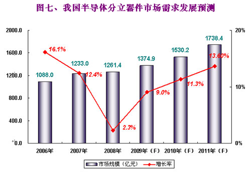 2008年我國分立器件產(chǎn)銷的一大亮點(diǎn)主要得益于全球電子整機(jī)對節(jié)能、環(huán)保需求的不斷增長,這一方面帶動了分立器件產(chǎn)品的需求增長,另一方面也帶動了市場產(chǎn)品結(jié)構(gòu)的快速升級。銷售額在LED產(chǎn)業(yè)大幅增長的帶動下仍增長了12.3%,在二極管、三極管增速相對平穩(wěn)之時,而以MOSFET和IGBT為主的功率晶體管的廣泛應(yīng)用于PC、筆記本電腦、計(jì)算機(jī)電源配件、液晶電視等而得到提升。2008年我國分立器件產(chǎn)量達(dá)到2461.13億只,同比下降1.1%;2008年我國分立器件銷售額達(dá)到937.8億元,同比增長12.3%。(CSIA、CCID年度報告)
