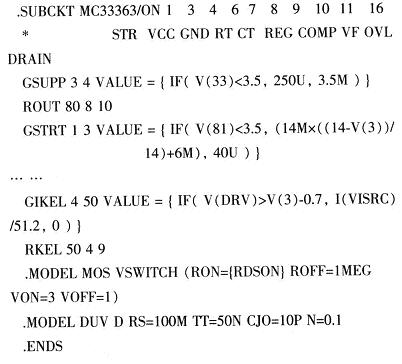 語句GSUPP34VALUE={IF(V(33)<3.5,250U,3.5M)},表示節(jié)點(diǎn)33和節(jié)點(diǎn)3、4之間連接的模塊實(shí)現(xiàn)當(dāng)輸入端33節(jié)點(diǎn)的電壓小于3.5V時(shí),輸出端節(jié)點(diǎn)3和節(jié)點(diǎn)4之間的電壓為250μF,否則為3.5mV。該網(wǎng)格表使用到的EVALUE和GVALUE器件是將輸出量和輸入量之間運(yùn)算函數(shù)關(guān)系用語句表示。EVALUE和GVALUE稱為模擬行為模型(ABM)器件,除了這兩個(gè)外還有:*SUM、*MULT、*TABLE、ABS、LOG等,帶有“*”符號的元器件,有E、G兩種類型。使用ABM器件可省去實(shí)現(xiàn)這些換算的電路,簡化子電路建模的工作量。