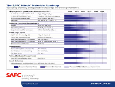 今年七月,在舊金山舉行的 Semicon West 展會(huì)上,我們針對(duì)硅半導(dǎo)體基底的化學(xué)氣相沉積 (CVD) 和原子層沉積 (ALD) 工藝公開了新的材料發(fā)展規(guī)劃。 規(guī)劃(圖 1 )概述了當(dāng)前及未來(lái)先進(jìn)的存儲(chǔ)和邏輯設(shè)備的發(fā)展道路,包括阻擋層、互連、介電材料和金屬,我們預(yù)期逐步推出,直至 2014 年完成。
