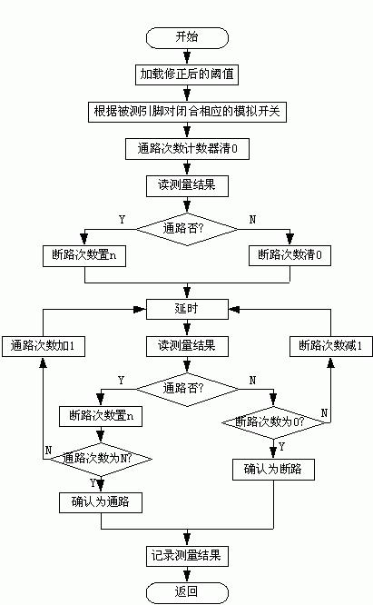 為了消除電容元件和模擬開關(guān)抖動(dòng)的影響需要延長(zhǎng)測(cè)量時(shí)間,而要消除電感元件的影響,則要利用感生電動(dòng)勢(shì)在很短時(shí)間內(nèi)確定,為此程序中設(shè)置了兩個(gè)計(jì)數(shù)器:通路次數(shù)計(jì)數(shù)器和斷路次數(shù)計(jì)數(shù)器。設(shè)置通路次數(shù)N是為了消除模擬開關(guān)閉合瞬間由于電容充電產(chǎn)生的假通路影響,即當(dāng)累計(jì)讀得N次通路結(jié)果時(shí),一般對(duì)電容的充電已結(jié)束,才確認(rèn)被測(cè)量點(diǎn)間為通路。設(shè)置斷路次數(shù)n是為了排除模擬開關(guān)抖動(dòng)所引起的干擾,一般在連續(xù)測(cè)得n次斷路結(jié)果時(shí)表明模擬開關(guān)的抖動(dòng)已經(jīng)結(jié)束,才能確認(rèn)為斷路。但因?yàn)殡姼械母猩妱?dòng)勢(shì)在模擬開關(guān)閉合瞬間最大,隨后迅速下降,所以如果第一次和第二次測(cè)量結(jié)果都為斷路,則確認(rèn)為斷路。由于幾種情況之間互相矛盾,計(jì)數(shù)器及延時(shí)的值是在權(quán)衡三種情況的基礎(chǔ)上根據(jù)實(shí)際情況確定的。