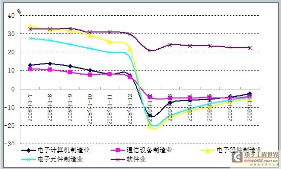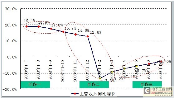 2008年三季度,受全球金融危機(jī)的影響,中國(guó)電子信息產(chǎn)業(yè)出現(xiàn)下滑趨勢(shì)。7-8月,主營(yíng)收入增長(zhǎng)率下滑0.2個(gè)百分點(diǎn),8-9月,增長(zhǎng)率下滑1.3個(gè)百分點(diǎn)。進(jìn)入第四季度,下滑幅度開(kāi)始增大,9-10月,增長(zhǎng)率下滑了1.9個(gè)百分點(diǎn),至2009年2月,主營(yíng)收入增長(zhǎng)率跌至最低點(diǎn)。從2009年2月電子信息產(chǎn)業(yè)振興規(guī)劃獲得通過(guò),4月振興規(guī)劃正式發(fā)布到7月期間,伴隨著“家電下鄉(xiāng)”,“汽車下鄉(xiāng)”、調(diào)整出口退稅稅率等政策相繼實(shí)施,振興規(guī)劃對(duì)電子信息產(chǎn)業(yè)的提振效應(yīng)開(kāi)始顯現(xiàn)。賽迪顧問(wèn)研究數(shù)據(jù)顯示,從2009年4月起,電子信息產(chǎn)業(yè)經(jīng)濟(jì)運(yùn)行開(kāi)始出現(xiàn)企穩(wěn)跡象,主營(yíng)收入降幅趨緩,并逐漸開(kāi)始走出低谷。