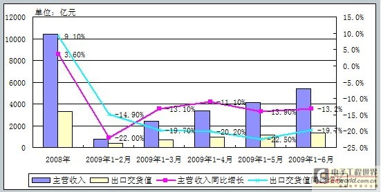 2009年3月重點(diǎn)企業(yè)主營(yíng)收入累計(jì)實(shí)現(xiàn)2388.0億元,在國(guó)外市場(chǎng)需求低迷不振,出口交貨持續(xù)走低的情況下大幅回升,相對(duì)2月,主營(yíng)收入同比降幅回升了近9個(gè)百分點(diǎn),二季度則進(jìn)入平穩(wěn)調(diào)整。重點(diǎn)企業(yè)出口交貨2009年初持續(xù)下滑,5月份開(kāi)始出現(xiàn)觸底回升跡象,但出口形勢(shì)依舊不容樂(lè)觀。預(yù)計(jì)振興規(guī)劃各項(xiàng)措施的不斷落實(shí),將為電子信息產(chǎn)業(yè)發(fā)展帶來(lái)增長(zhǎng)動(dòng)力。