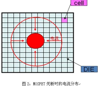如果MOSFET所加的負(fù)載為感性負(fù)載,由于電感電流不能突變,導(dǎo)致流過MOSFET的電流向晶元的中間流動,如圖2所示。這樣就會造成MOSFET局部單元過熱而導(dǎo)致MOSFET局部單元損壞。如果加快MOSFET的關(guān)斷速度,以盡量讓MOSFET快速關(guān)斷,不讓能量產(chǎn)生集聚點,這樣就不會因局部單元過熱而損壞MOSFET。注意到:MOSFET的關(guān)斷過程是一個由穩(wěn)態(tài)向非穩(wěn)態(tài)過渡的過程,與此相反,MOSFET在開通時,由于負(fù)載的電流是隨著單元的逐漸開通而不斷增加的,因此是一個向穩(wěn)態(tài)過渡的過程,不會出現(xiàn)關(guān)斷時產(chǎn)生的能量集聚點。
