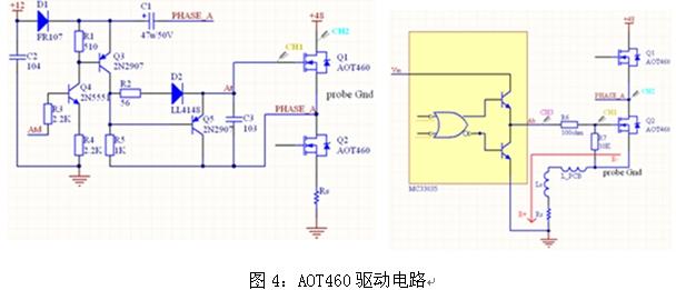 圖4是電動車控制器的兩種驅(qū)動MOSFET管AOT460驅(qū)動電路,分立器件驅(qū)動時,PWM在上橋臂,直接用MC33035驅(qū)動時,PWM在下橋臂。