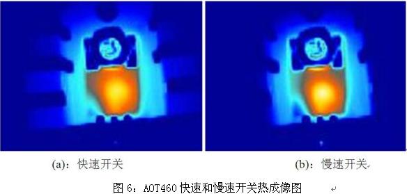 圖6為AOT460在同一應(yīng)用中快速開關(guān)和慢速開關(guān)情況下的熱成像照片??梢钥闯?,在慢速開關(guān)情況下MOSFET的局部溫度要高于快速開關(guān)情況下的溫度,過慢的開關(guān)速度會導(dǎo)致MOSFET因局部溫度過高而提前失效。