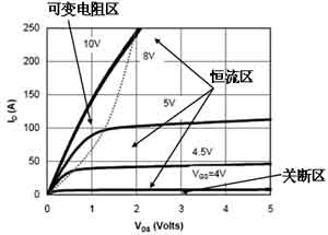 MOSFET的漏極導(dǎo)通特性與開關(guān)過程MOSFET的漏極導(dǎo)通特性如圖2所示。MOSFET與三極管一樣,當(dāng)MOSFET應(yīng)用于放大電路時(shí),通常要使用此曲線研究其放大特性。只是三極管使用的基極電流、集電極電流和放大倍數(shù),而MOSFET使用柵極電壓、漏極電流和跨導(dǎo)。