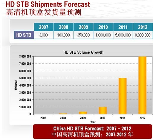 此外,博通特別對(duì)高清機(jī)頂盒市場(chǎng)做了分析。寬帶通訊事業(yè)部資深市場(chǎng)總監(jiān)JohnGleiter說,由于政府大力推進(jìn)高清內(nèi)容進(jìn)入消費(fèi)者市場(chǎng),預(yù)示著中國(guó)的高清機(jī)頂盒產(chǎn)業(yè)正式破冰啟航。與此同時(shí),廣電總局要求的九套免費(fèi)高標(biāo)清同播的衛(wèi)視節(jié)目將從現(xiàn)在開始不斷完善。在總局內(nèi)容高清化的時(shí)間表中,到2010年,這五套衛(wèi)視的所有節(jié)目都需實(shí)現(xiàn)高、標(biāo)清同播,這就打開了之前制約高清電視發(fā)展的內(nèi)容瓶頸。而高清平板電視機(jī)的普及更為高清大發(fā)展迎來了契機(jī)。目前70%的平板電視機(jī)是高清或全高清兼容的,這就意味著購(gòu)買高清電視機(jī)的消費(fèi)者將成為運(yùn)營(yíng)商挖掘的潛在用戶。單一的數(shù)字化整轉(zhuǎn)運(yùn)營(yíng)商需要大量的成本投入,現(xiàn)在很多運(yùn)營(yíng)商將未來的盈利模式都鎖定在高清和互動(dòng)兩個(gè)方面,所以未來可能有更多的運(yùn)營(yíng)商考慮“高清轉(zhuǎn)換”,這就帶來了有線高清機(jī)頂盒將在2010年大幅增長(zhǎng)的趨勢(shì)。In-Stat預(yù)測(cè),到2010年末將交付50萬臺(tái)先進(jìn)的有線電視機(jī)頂盒,這些機(jī)頂盒都將具有高清處理能力。