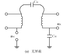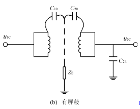 在圖1(a)中,隔離變壓器不加屏蔽層,C12是一次繞組和二次繞組之間的分布電容,在共模電壓u1C的作用下,二次繞組所耦合的共模噪聲電壓為u2C,C2E是二次側(cè)的對(duì)地電容,則從圖可知二次側(cè)的共模噪聲電壓u2C為:
