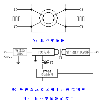 脈沖變壓器的匝數(shù)較少,而且一次繞組和二次繞組分別繞于鐵氧體磁芯的兩側(cè),這種工藝使得它的分布電容特小,僅為幾個(gè)pF,所以可作為脈沖信號(hào)的隔離元件。脈沖變壓器傳遞輸入、輸出脈沖信號(hào)時(shí),不傳遞直流分量,因而在微電子技術(shù)控制系統(tǒng)中得到了廣泛的應(yīng)用。一般地說(shuō),脈沖變壓器的信號(hào)傳遞頻率在1kHz~1MHz之間,新型的高頻脈沖變壓器的傳遞頻率可達(dá)到10MHz。圖5(a)是脈沖變壓器的示意圖。脈沖變壓器主要用于晶閘管(SCR)、大功率晶體管(CTR)、IGBT等可控器件的控制隔離中。圖5(b)是脈沖變壓器的應(yīng)用實(shí)例。