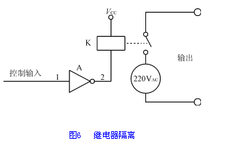繼電器是常用的數(shù)字輸出隔離元件,用繼電器作為隔離元件簡(jiǎn)單實(shí)用,價(jià)格低廉。圖6是繼電器輸出隔離的實(shí)例示意圖。在該電路中,通過(guò)繼電器把低壓直流與高壓交流隔離開(kāi)來(lái),使高壓交流側(cè)的干擾無(wú)法進(jìn)入低壓直流側(cè)。