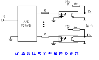 數(shù)模轉(zhuǎn)換(D/A)電路的隔離與模數(shù)轉(zhuǎn)換(A/D)電路的隔離類似,因而所采取的技術(shù)措施也差不多,圖7(d)是數(shù)模轉(zhuǎn)換(D/A)電路的隔離方法之一。