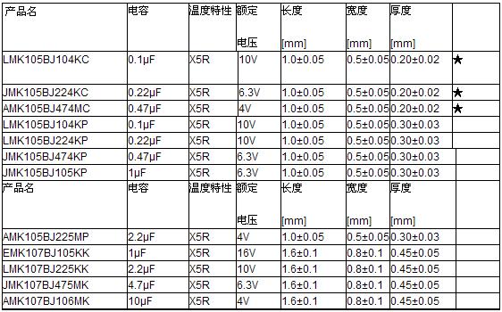 超薄陶瓷電容器的產(chǎn)品線如下:(★:本文介紹的新品)。