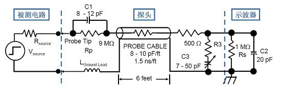 圖3給出了電阻分壓的探頭等效電路,Rp和Rs構成了一個10:1的分壓器,Rs為示波器的輸入阻抗。調節(jié)補償電容C3使得探頭和示波器通道RC乘積相匹配,這樣就能保證在探頭的尖端獲得正確的頻率響應曲線,并且這種探頭的頻率響應比1:1探頭頻率響應要寬得多。