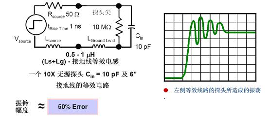 從以上分析可以清楚的看到接地引線電感對測量結果的影響,所以一定要使探頭的接地引線盡可能的短,特別是在測高頻和快速上升沿的信號時尤應注意。