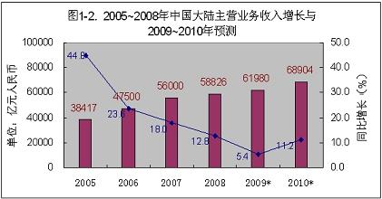 據(jù)工業(yè)和信息化部運(yùn)行監(jiān)測協(xié)調(diào)局統(tǒng)計(jì),今年1~9月份,中國大陸電子制造業(yè)主營業(yè)務(wù)收入35,285億元,同比增長-1.8%;從1月份的-15%收窄到9月份的-1.8%,平均每月收窄1.65個(gè)百分點(diǎn)。據(jù)此平均值推算,并考慮到第四季度一般要好于前三個(gè)季度的情況,規(guī)模以上電子信息制造業(yè)主營業(yè)務(wù)收入,將在10月份接近去年的同期水平,到今年年底,制造業(yè)主營業(yè)務(wù)收入應(yīng)能回升到3.2%,達(dá)到52,892億元(見圖1)。據(jù)工業(yè)和信息化部運(yùn)行監(jiān)測協(xié)調(diào)局統(tǒng)計(jì),今年1~9月份軟件業(yè)收入6775億元,同比增長20.3%,。如能繼續(xù)保持20%左右的增長,今年的軟件收入可達(dá)9,088億元。則2009年電子信息行業(yè)的總營業(yè)額將達(dá)到61,980億元(約折合9,115億美元),總營業(yè)額將比2008年增長5.4%。預(yù)計(jì)2010年,在國際經(jīng)濟(jì)回暖和繼續(xù)擴(kuò)大內(nèi)需的推動(dòng)下,中國大陸電子信息產(chǎn)業(yè)主營業(yè)務(wù)總收入將實(shí)現(xiàn)11.2%左右的增長,達(dá)到68,904億元(約折合10,133億美元)(見圖2)。