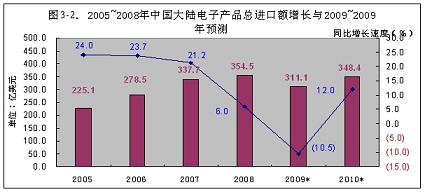根據(jù)國家海關(guān)總署提供的數(shù)據(jù)分析,今年1~9月份電子產(chǎn)品進(jìn)口總額為3,017.6億美元,同比下降18.2%,比元月份回升了28.9個(gè)百分點(diǎn)。按每月進(jìn)口額回升幅度的平均值(2.5個(gè)百分點(diǎn))推算,今年總進(jìn)口額下降速度應(yīng)回升到-10.5%,達(dá)到3,111億美元(見圖3-1)。中國大陸進(jìn)口的主要電子產(chǎn)品是電子元器件和技術(shù)設(shè)備,預(yù)計(jì)2010年,在電子整機(jī)出口回升和國內(nèi)需求增長的驅(qū)動(dòng)下,總進(jìn)口額將達(dá)到或超過2008年的3,476美元水平(見圖3-2)。