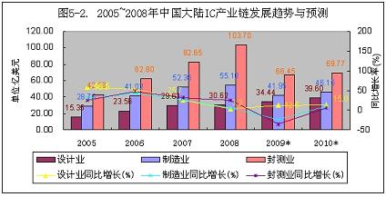 據(jù)中國半導(dǎo)體行業(yè)協(xié)會(huì)統(tǒng)計(jì),今年1~9月份IC設(shè)計(jì)業(yè)、制造業(yè)和封裝業(yè)的銷售收入分別比2008年增長10.2%、-25.4%和-37.2%,制造業(yè)和封裝業(yè)下降幅度較大。預(yù)計(jì)2010年會(huì)隨著國內(nèi)經(jīng)濟(jì)和出口形勢的好轉(zhuǎn),將逐步回升到小幅度正增長(見圖5-1、5-2)。