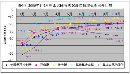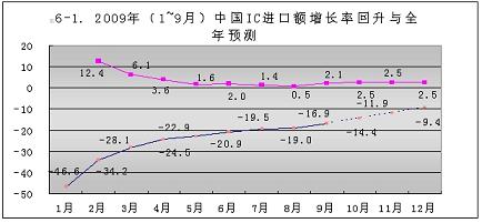 今年1~9月份,中國大陸進(jìn)口集成電路的降幅不斷回升,從元月份的-46.6%,回升到9月份的-16.9%。共回升了29.7個(gè)百分點(diǎn)。按此回升速度,到今年年底可回升到-9.4%(見圖6-1)。