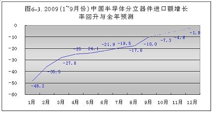 今年1~9月份,半導(dǎo)體分立器件進(jìn)口額增長率回升明顯。從元月份的-48.2%,回升到9月份的-10.0%,共回升了38.2個(gè)百分點(diǎn)。按此回升速度,到今年年底可回升到-1.9%(見圖6-3)。