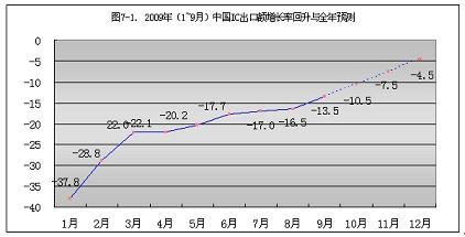 2009年1~9月份,中國大陸IC出口額的增長率從元月份的-37.8%,回升到9月份的-13.5%?;厣?4.3個(gè)百分點(diǎn)。按此回升速度計(jì)算,到今年年底,可回升到-4.5%(見圖7-1)。