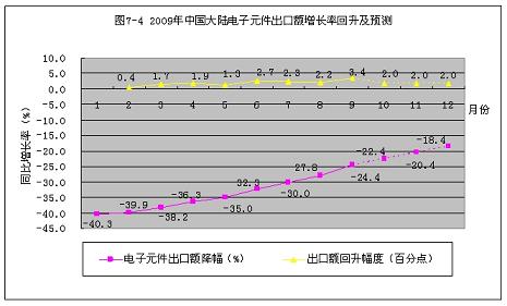 2009年1~9月份,中國大陸電子組件出口額增長率從元月份的-40.3%,回升到9月份的-24.4%?;厣?5.9個(gè)百分點(diǎn)。按此回升速度計(jì)算,到今年年底,可回升到-18.4%(見圖7-4)。