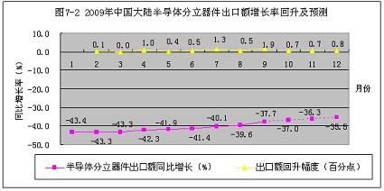 2009年1~9月份,中國大陸半導(dǎo)體分立器件出口額增長率從元月份的-43.4%,回升到9月份的-37.7%。只回升了5.7個(gè)百分點(diǎn)。按此回升速度計(jì)算,到今年年底,只能回升到-35.5%,預(yù)計(jì)2010年會(huì)有所好轉(zhuǎn)(見圖7-2)。