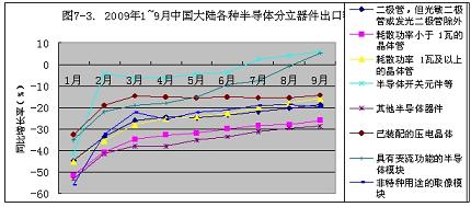 2009年1~9月份,中國大陸半導(dǎo)體分立器件出口額增長率較大的是半導(dǎo)體開關(guān)組件、具有變流功能的半導(dǎo)體模塊和已裝配的壓電晶體(見圖7-3)。