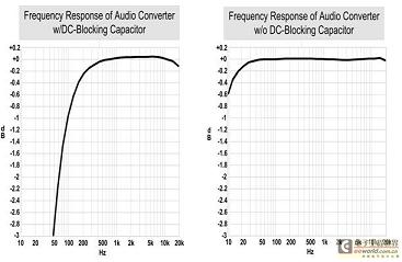用來隔離DC電流的最常見技術(shù)是采用去耦電容,如圖1所示。在信號路徑中放置一個電容可以創(chuàng)建一個高通濾波器,其角頻率由耳機阻抗(R)和去耦電容(C)設(shè)置,等于1/(2πRC)。通常人的耳朵能夠聽到聲音頻率最低為20Hz。根據(jù)這個下限和耳機的典型阻抗,可很容易地計算出所需的電容值。對于20Hz的角頻率,電容容值取500uF。