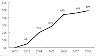 自2003年啟動(dòng)半導(dǎo)體照明工程和“十一五”863重大項(xiàng)目實(shí)施以來,我國(guó)LED外延材料、芯片制造、器件封裝、熒光粉等方面均已顯現(xiàn)具有自主技術(shù)產(chǎn)權(quán)的單元技術(shù),部分核心技術(shù)具有原創(chuàng)性,初步形成了從上游材料、中游芯片制備、下游器件封裝及集成應(yīng)用的比較完整的研發(fā)與產(chǎn)業(yè)體系,為我國(guó)LED產(chǎn)業(yè)做大做強(qiáng)在一定程度上奠定了基礎(chǔ)。目前我國(guó)芯片企業(yè)產(chǎn)業(yè)化線上完成的功率型芯片封裝后光效超過90lm/W。具有自主知識(shí)產(chǎn)權(quán)的功率型硅襯底led芯片封裝后光效達(dá)到78lm/W,處于國(guó)際先進(jìn)水平。根據(jù)國(guó)家半導(dǎo)體照明工程研發(fā)及產(chǎn)業(yè)聯(lián)盟統(tǒng)計(jì),從2004年開始國(guó)內(nèi)LED產(chǎn)業(yè)累計(jì)新增投資規(guī)模達(dá)150億元,最近連續(xù)3年,每年企業(yè)訂購并安裝投入的MOCVD數(shù)量超過50臺(tái)以上,國(guó)產(chǎn)化率大幅提高,截止2008年底,芯片國(guó)產(chǎn)化率達(dá)到49%(見圖1)。按照目前聯(lián)盟成員單位的擴(kuò)產(chǎn)計(jì)劃和機(jī)臺(tái)訂單數(shù)量,預(yù)計(jì)未來3年國(guó)內(nèi)將增加MOCVD近兩百臺(tái)。目前Cree、旭明以及臺(tái)灣芯片廠商都以合資的形式進(jìn)入了國(guó)內(nèi),勢(shì)必進(jìn)一步帶動(dòng)芯片的國(guó)產(chǎn)化。2015年芯片國(guó)產(chǎn)化率有可能達(dá)到70%。