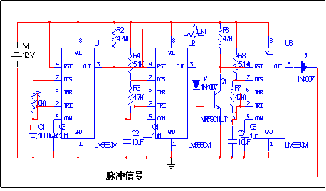 充電電路與脈沖信號(hào)結(jié)合,對(duì)電路進(jìn)行充電。這里的脈沖信號(hào)可用555定時(shí)器來實(shí)現(xiàn),用3個(gè)555來構(gòu)成一個(gè)頻率在周期變化的脈沖信號(hào)。電路圖如圖。