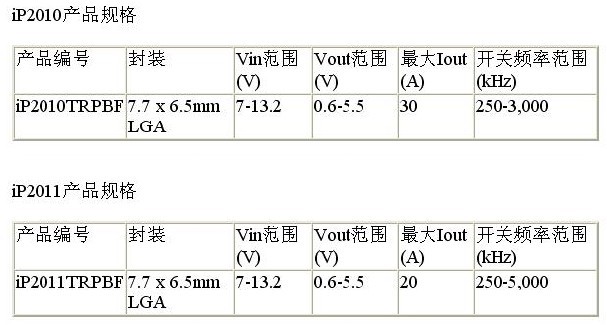 iP2010的輸入電壓范圍為7V至13.2V,輸出電壓范圍則為0.6V至5.5V,輸出電流高達(dá)30A。這個(gè)器件最高運(yùn)行頻率為3MHz。在5MHz運(yùn)行時(shí),與iP2010引腳兼容的iP2011備有相同的輸入和輸出電壓范圍,但后者經(jīng)過(guò)優(yōu)化,從而使最高輸出電流高達(dá)20A。通過(guò)以通用占位面積提供多種電流額定值器件,IR提供的靈活性能夠滿足不同客戶對(duì)電流水平、性能和成本的要求。