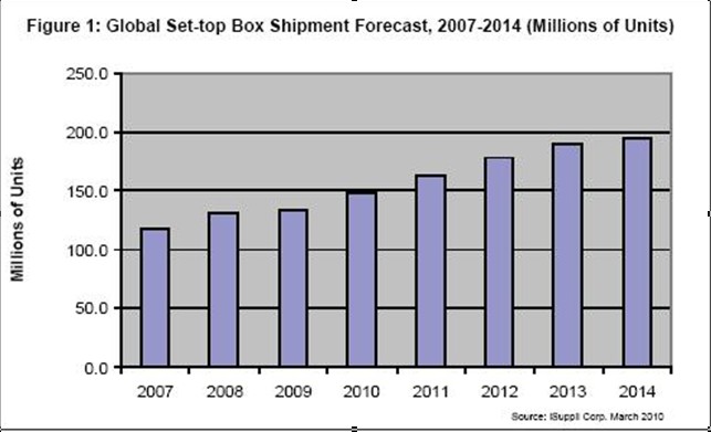 據(jù)iSuppli公司,機頂盒出貨量未來幾年將繼續(xù)增長。消費者收看模式發(fā)生轉變,通過互聯(lián)網提供的電視內容越來越流行,從而將為提供商創(chuàng)造條件,在數(shù)字家庭的激烈爭奪中獲得新的營業(yè)收入來源。