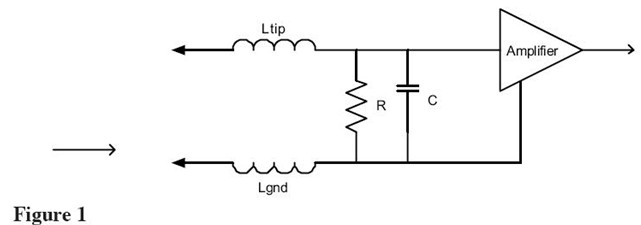 單端探頭有兩個輸入端——信號(尖端)和地。等效電路包括電感、DC電阻并聯(lián)的輸入電容和地夾的電感。地夾電感可以和尖端電感歸結(jié)在一起以簡化電路。有源探頭的等效電路如Figure1所示。給出的電感有兩個——尖端和地夾電感。地夾電感通常占主導(dǎo)地位并依據(jù)用戶連接待測系統(tǒng)地的方式而改變。