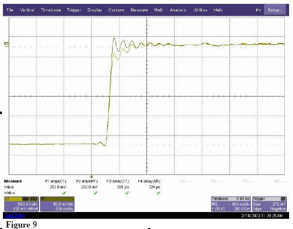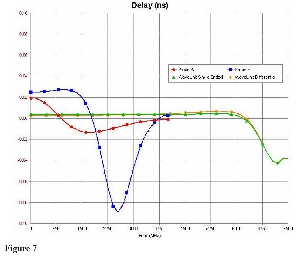 新的WaveLinks探頭不通過同一個測試信號,測量結(jié)果如Figure 10 所示。由于探頭負(fù)載(<1%)信號幅度有輕微的減少,但主要的信號邊沿完全沒有失真。探頭阻抗產(chǎn)生的延遲是2ps,不會隨著信號頻率改變。