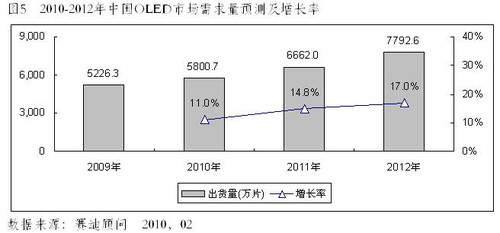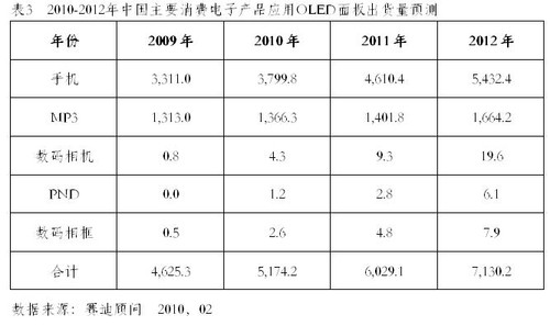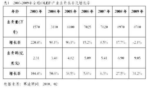 2010年4月13日,中國權(quán)威ICT研究與管理咨詢機(jī)構(gòu)賽迪顧問股份有限公司在“2010中國消費(fèi)電子市場年會(huì)”上發(fā)布《2009-2010年中國OLED產(chǎn)業(yè)發(fā)展研究年度報(bào)告》顯示:隨著手機(jī)和MP3/MP4等應(yīng)用產(chǎn)品需求的推動(dòng),OLED顯示屏市場自2003年開始快速成長,到2009年,全球OLED出貨量達(dá)到8780萬片,由于受到全球終端產(chǎn)品有所減緩的影響,特別是手機(jī)和MP3市場出貨量的下滑,加上PMOLED全球產(chǎn)量明顯降低,但AMOLED在得到面板廠商大力推動(dòng)下,特別是像諾基亞、三星、索愛等終端廠商,均在2009年推出一系列采用AMOLED屏幕的手機(jī),在應(yīng)用市場的推動(dòng)下,AMOLED有了較大的增長,不過OLED總體仍有所下滑。伴隨著AMOLED出貨量的增長和市場比例的提升,OLED整體產(chǎn)值有明顯的增長,2009年產(chǎn)值達(dá)到9.05億美元,較2008年成長31.2%,出貨量在下滑的同時(shí),而出貨額保持增長,AMOLED貢獻(xiàn)極為明顯。