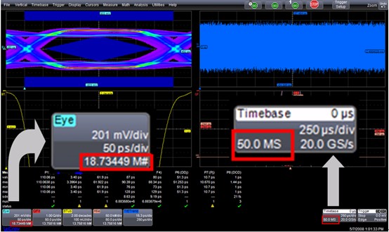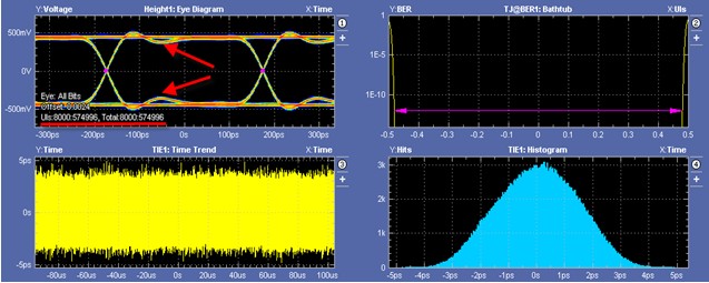 力科示波器捕獲了50MS的數(shù)據(jù),并一次性地對(duì)所有這些數(shù)據(jù)進(jìn)行眼圖測量,得到了18.73449M個(gè)比特位(UI)的眼圖。如下圖所示。