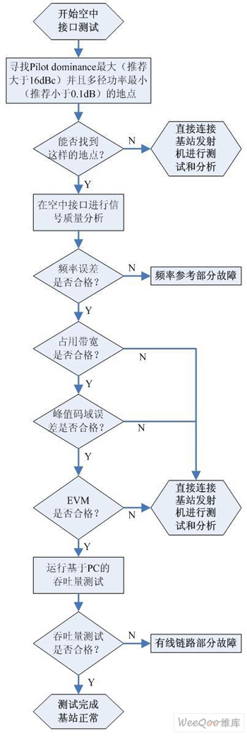 基于方便合理的原則,應(yīng)首先使用空中接口測量方式在合適的地點(diǎn)檢查基站發(fā)射機(jī)的信號(hào)覆蓋和信號(hào)質(zhì)量,爭取在空口測試中對(duì)基站狀態(tài)做出準(zhǔn)確判斷。如難以判斷空口測量結(jié)果或需要精確測量發(fā)射功率,則需要直接連接基站進(jìn)行測試。測試步驟如圖2所示。