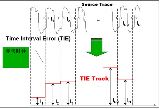 在圖2、圖3、圖4中的紅色曲線橫軸是時間,縱軸是對應(yīng)周期的抖動數(shù)值,該曲線反映了抖動隨時間變化的趨勢,稱為抖動跟蹤(Jitter track);將每個周期的抖動值(比如TIE抖動的I1、I2…In)作統(tǒng)計直方圖,可以得到抖動直方圖(Jitter Histogram);將抖動跟蹤做快速傅立葉變換(FFT)計算可以得到抖動頻譜(Jitter Spectrum)。