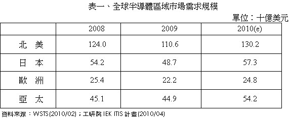 2009年全球半導(dǎo)體市場僅北美地區(qū)微幅成長1.7%,其他皆呈現(xiàn)負(fù)成長:亞太市場衰退3.5%,歐洲市場衰退21.9%,日本市場衰退21.0%。不景氣使得下游電子產(chǎn)品品牌大廠,如Dell、HP、Sony等廠商增加產(chǎn)品委外代工之比例,以降低生產(chǎn)成本,增加其產(chǎn)品競爭力。因此,2009年主要從事代工生產(chǎn)之亞太地區(qū),才會(huì)出現(xiàn)僅小幅衰退之情形。至于北美地區(qū)則是因?yàn)槭艿较掠纹放茝S商降價(jià)促銷成功,使得市場呈現(xiàn)小幅成長。