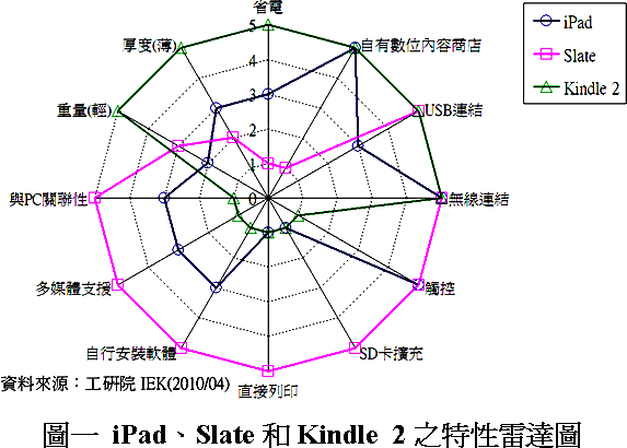 工研院IEK進(jìn)行iPad、Slate和Kindle 2三種產(chǎn)品有關(guān)省電、自有數(shù)位內(nèi)容商店、USB連結(jié)、無線連結(jié)、觸控、SD卡擴(kuò)充、直接列印、自行安裝軟體、多媒體支援、與PC關(guān)聯(lián)性、重量(輕)和厚度(薄)等特性的競(jìng)比,1分代表不具有其特性,為最低比重,分?jǐn)?shù)越高代表與此特性關(guān)聯(lián)性越強(qiáng),完全相關(guān)聯(lián)為最高5分,將其結(jié)果繪制成雷達(dá)圖(圖一)表示。