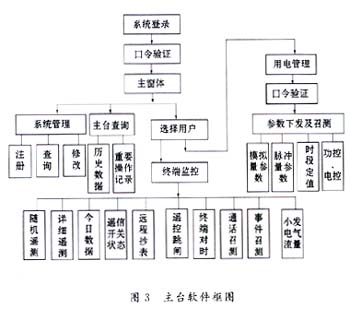 該無線電力負(fù)荷控制系統(tǒng)的管理軟件是用面向?qū)ο蟮木幊坦ぞ遃isualBasic6.0開發(fā)完成的,系統(tǒng)軟件框圖如圖3所示。系統(tǒng)啟動(dòng)后要求輸入操作員工號(hào)及口令,驗(yàn)證無誤后連接電臺(tái),進(jìn)入主窗體。