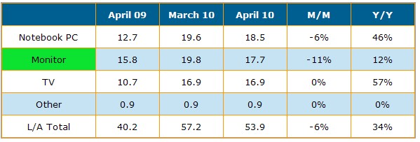 按應(yīng)用別統(tǒng)計(jì),可攜式計(jì)算機(jī)(包括notebook PC與上網(wǎng)本)及顯示器面板出貨量下滑,電視面板出貨量與上月持平。